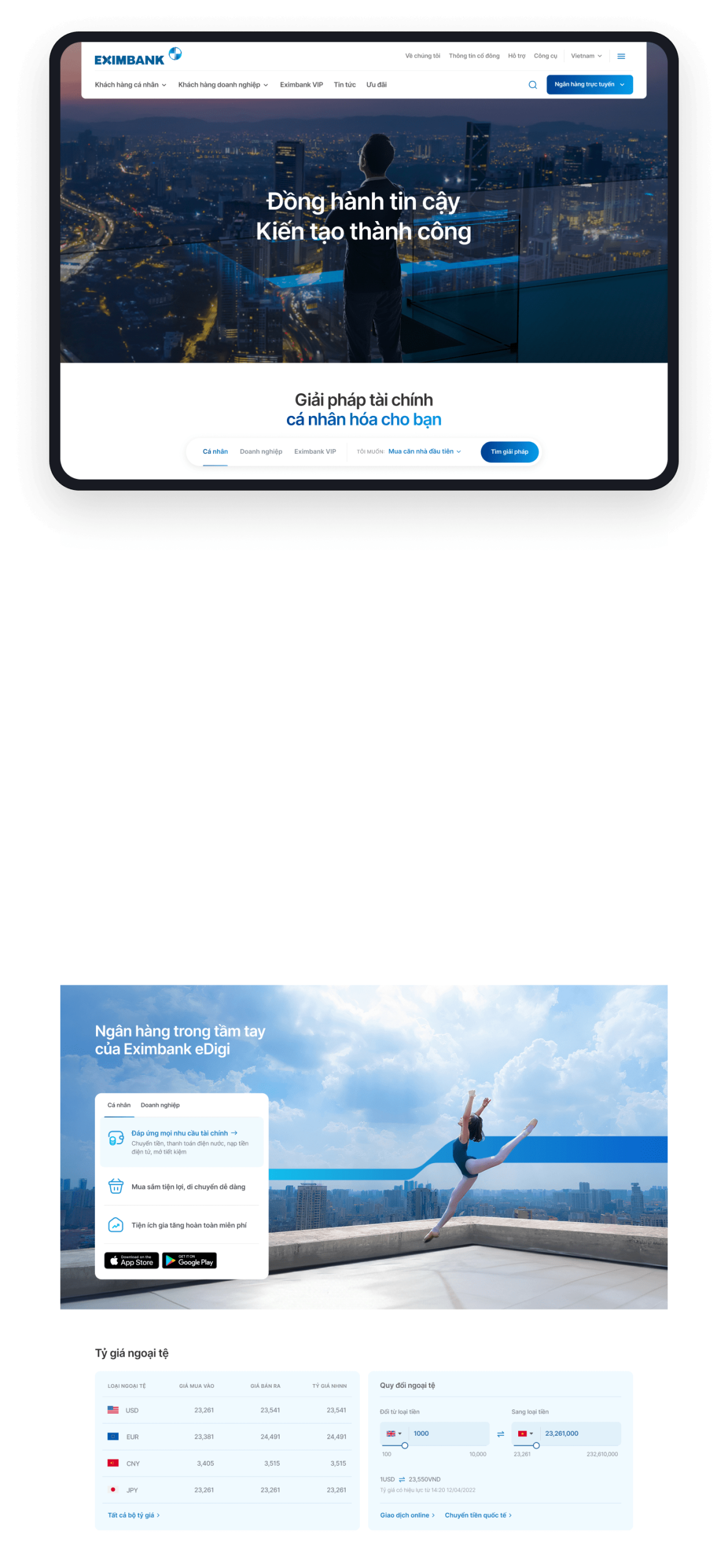 Dự án mang sứ mệnh kiến tạo diện mạo mới cho giao diện website, đánh dấu bước chuyển mình đột phá của Eximbank trong kỷ nguyên số. Giao diện website được thiết kế với mục tiêu thể hiện đẳng cấp thương hiệu, mang đến trải nghiệm số đỉnh cao thu hút khách hàng tiềm năng.