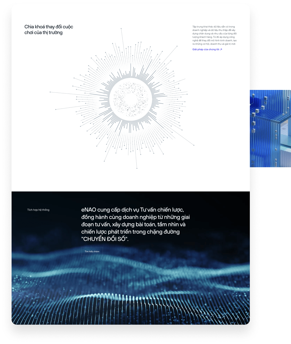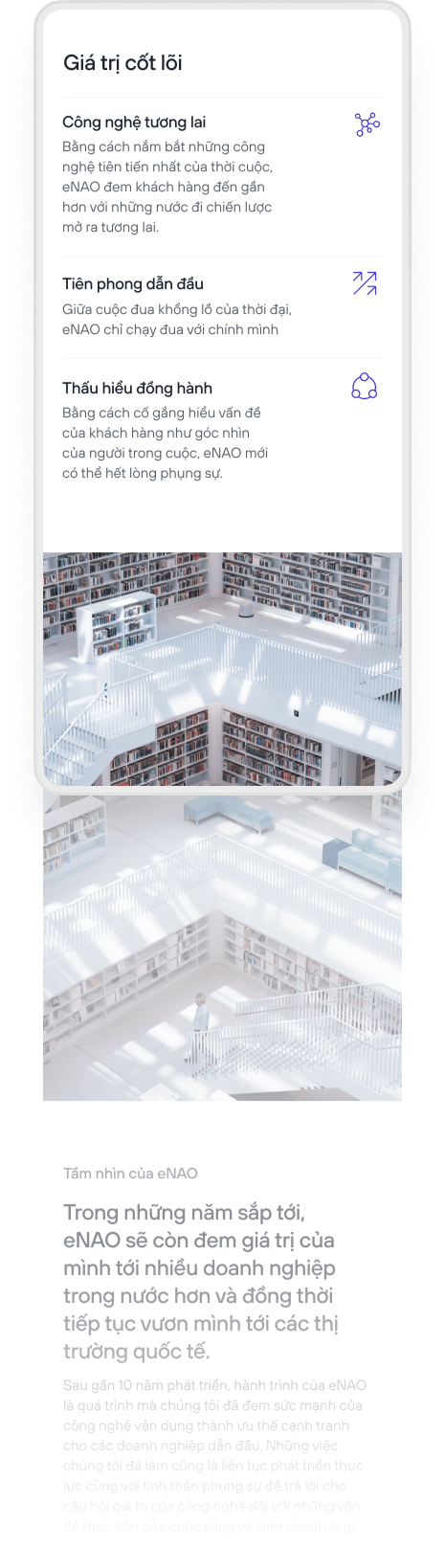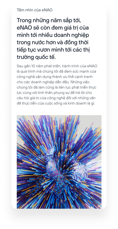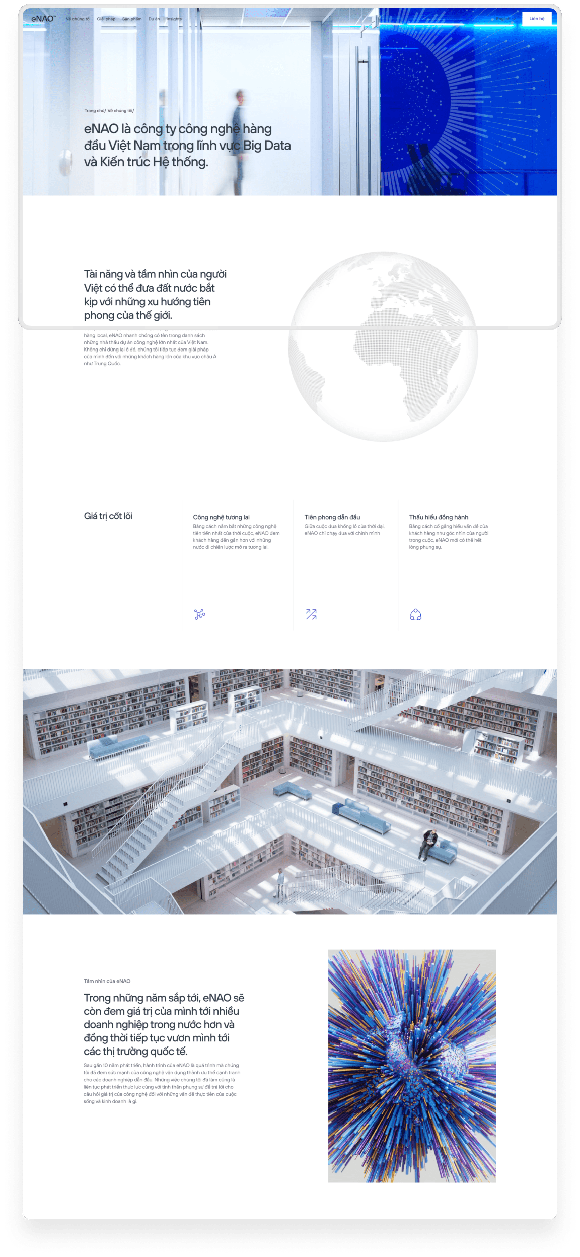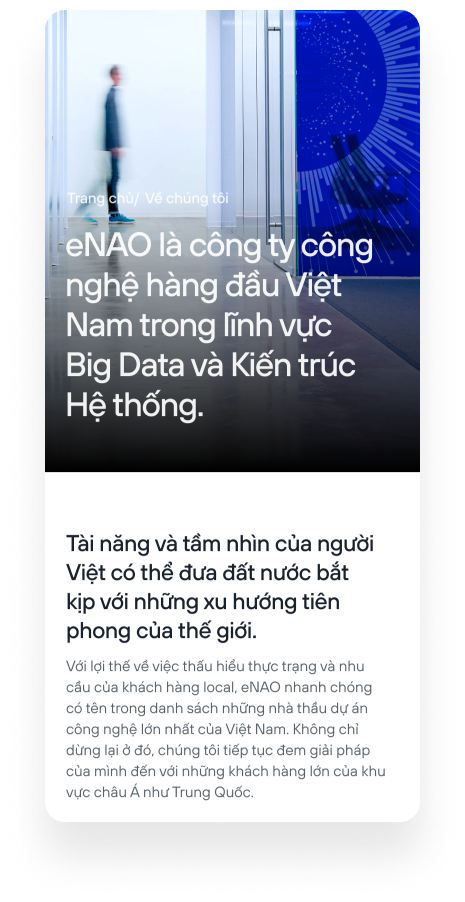 eNAO là công ty công nghệ hàng đầu Việt Nam trong lĩnh vực Big Data và Kiến trúc Hệ thống. Với lợi thế về việc thấu hiểu thực trạng và nhu cầu của khách hàng local, eNAO nhanh chóng có tên trong danh sách những nhà thầu dự án công nghệ lớn nhất của Việt Nam.
